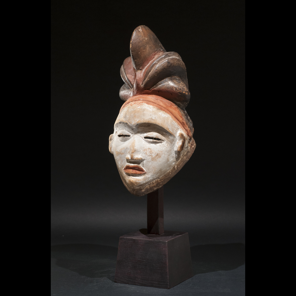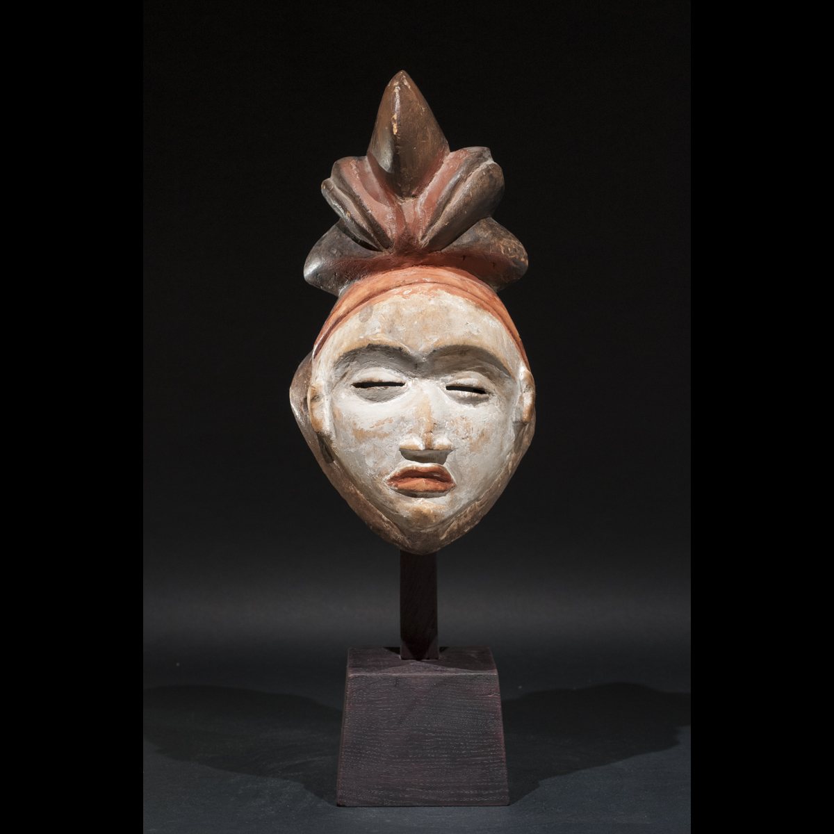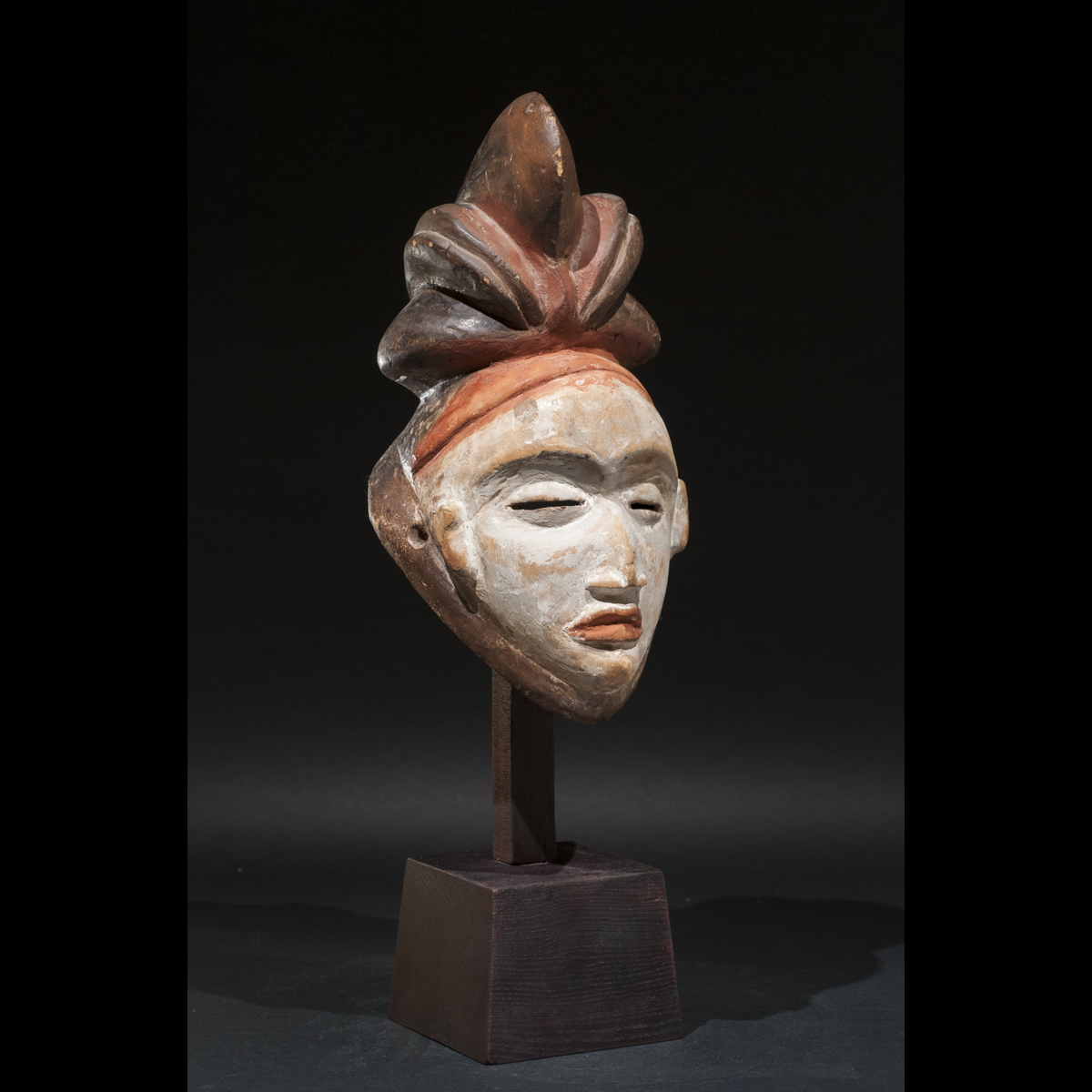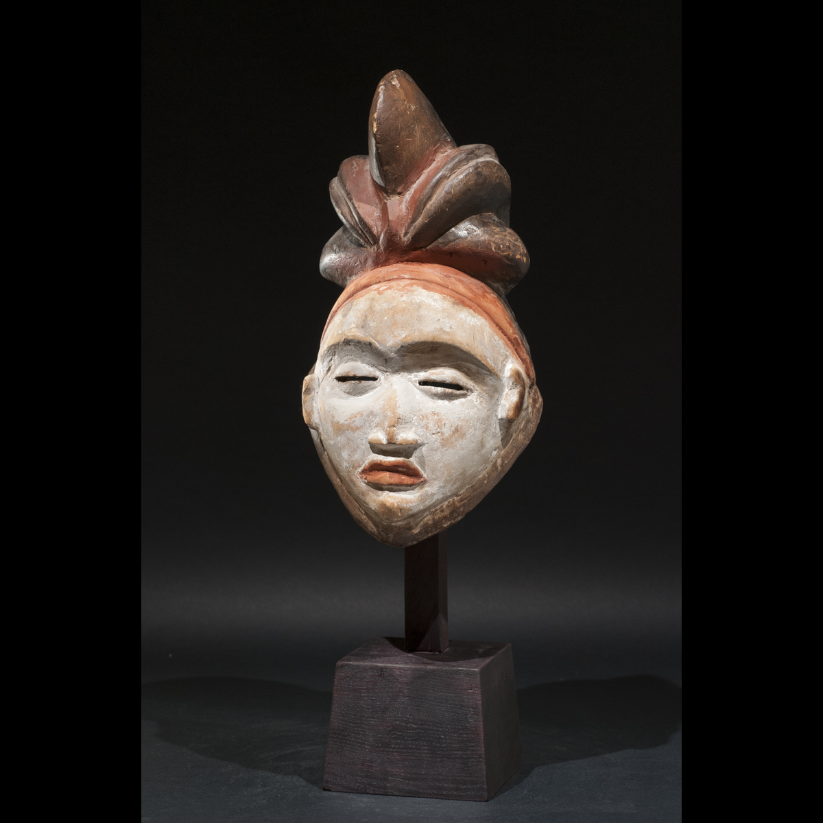 Exceptionnel masque Punu du Gabon. Il allie élégance et force intérieure. Sous tous ses angles il nous dévoile sa beauté. Son regard est perçant et intimidant, sa bouche est tendue, l'expression de son visage est dure. Sa présence est puissante et majestueuse. Les pigments colorés blanc et orange rehausse son visage et l'illumine. C'est une œuvre vivante réalisé par un artiste au sommet de son art qui a su lui insuffler la vie. On notera la beauté et la singularité de sa coiffe. D'après Louis Perrois, les coiffes de ce style à coques multiples sont extrêmement rares. Une magnifique pièce de collection ancienne et authentique, circa 1930.