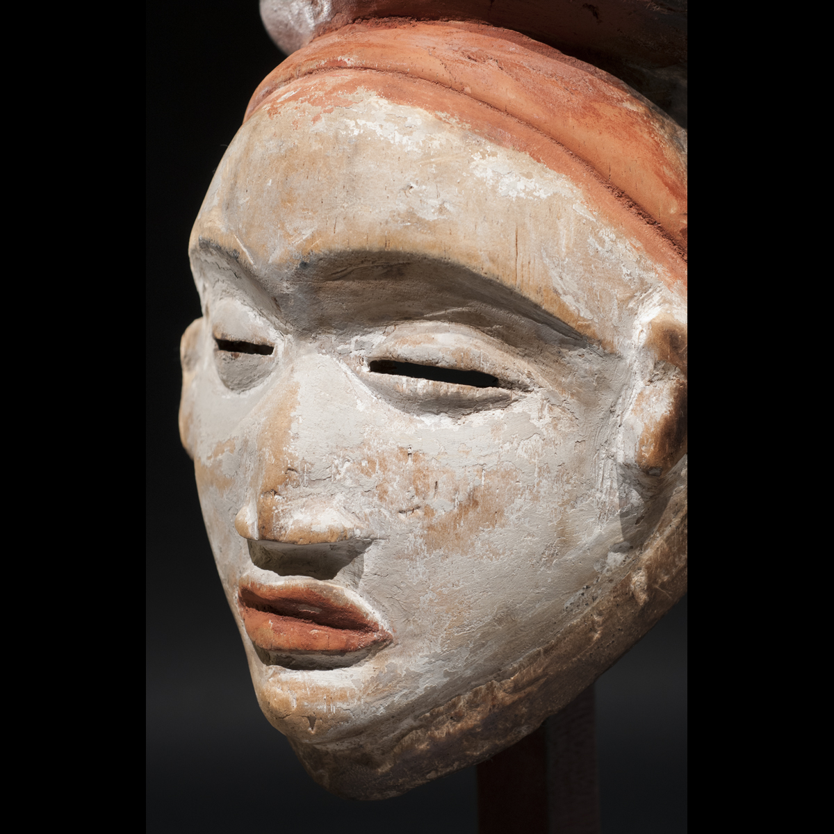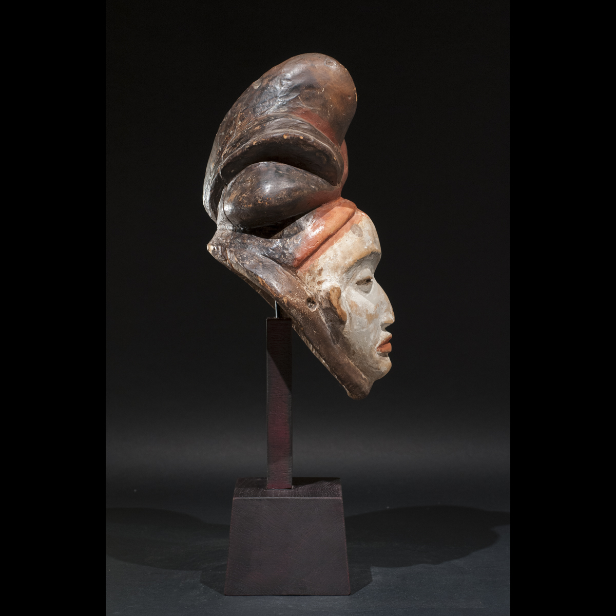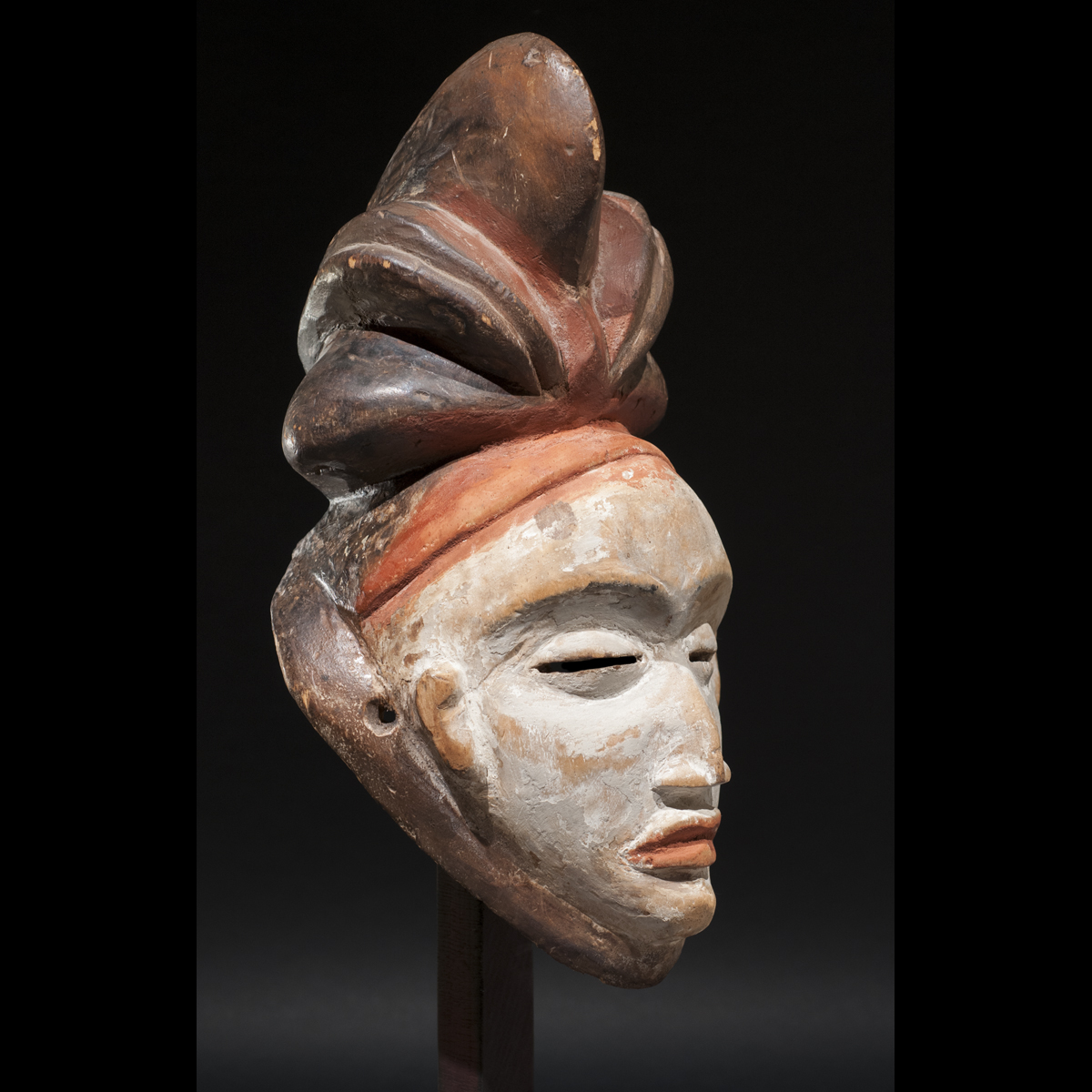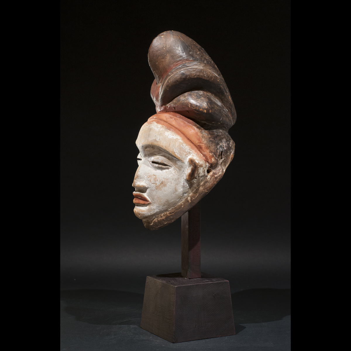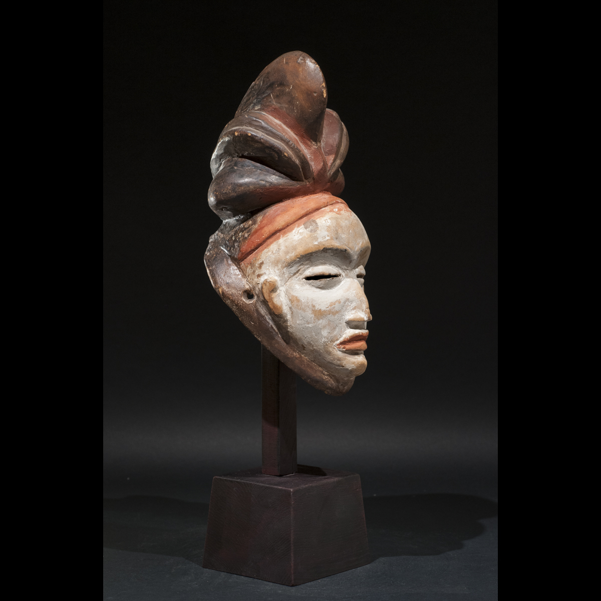 Exceptionnel masque Punu du Gabon. Il allie élégance et force intérieure. Sous tous ses angles il nous dévoile sa beauté. Son regard est perçant et intimidant, sa bouche est tendue, l'expression de son visage est dure. Sa présence est puissante et majestueuse. Les pigments colorés blanc et orange rehausse son visage et l'illumine. C'est une œuvre vivante réalisé par un artiste au sommet de son art qui a su lui insuffler la vie. On notera la beauté et la singularité de sa coiffe. D'après Louis Perrois, les coiffes de ce style à coques multiples sont extrêmement rares. Une magnifique pièce de collection ancienne et authentique, circa 1930.