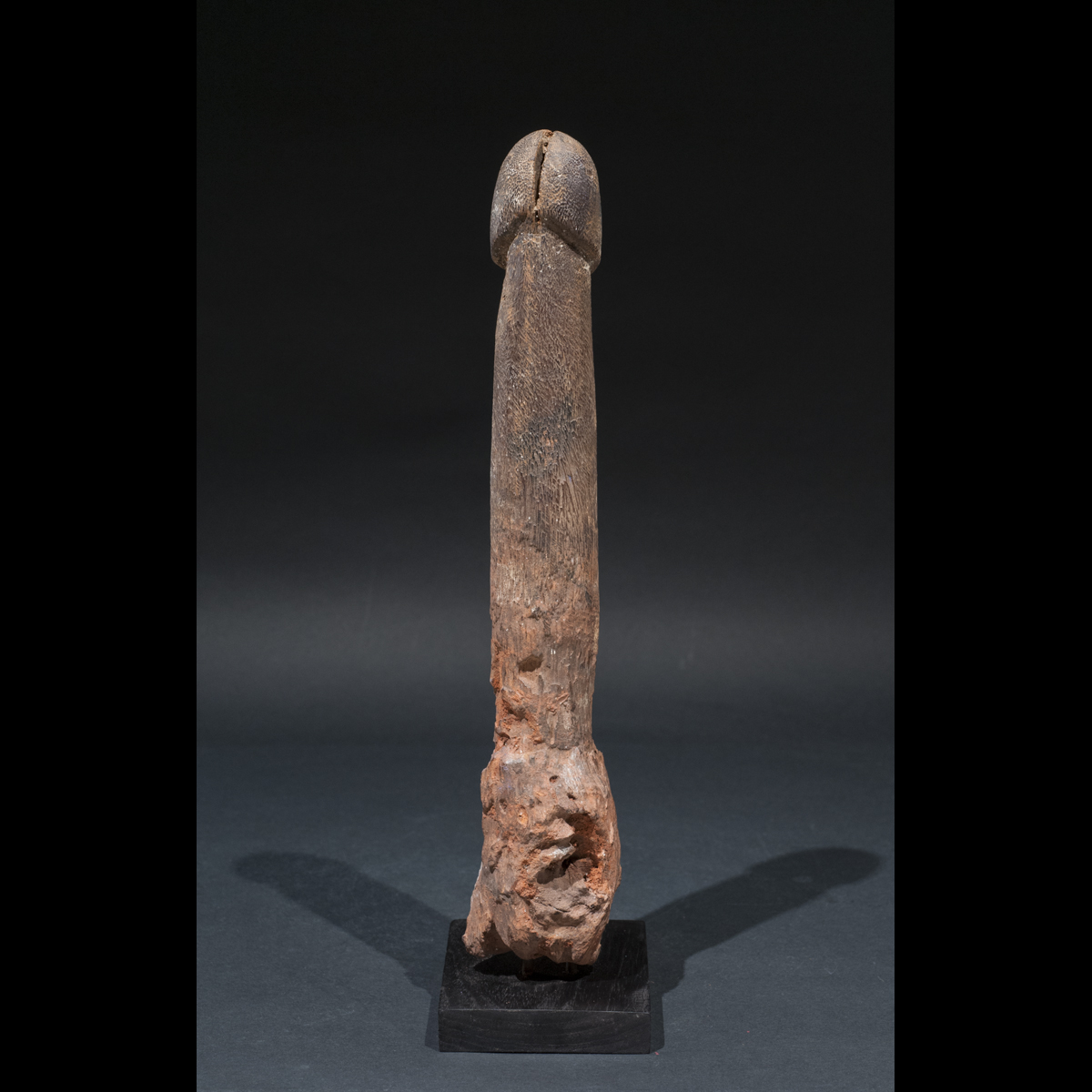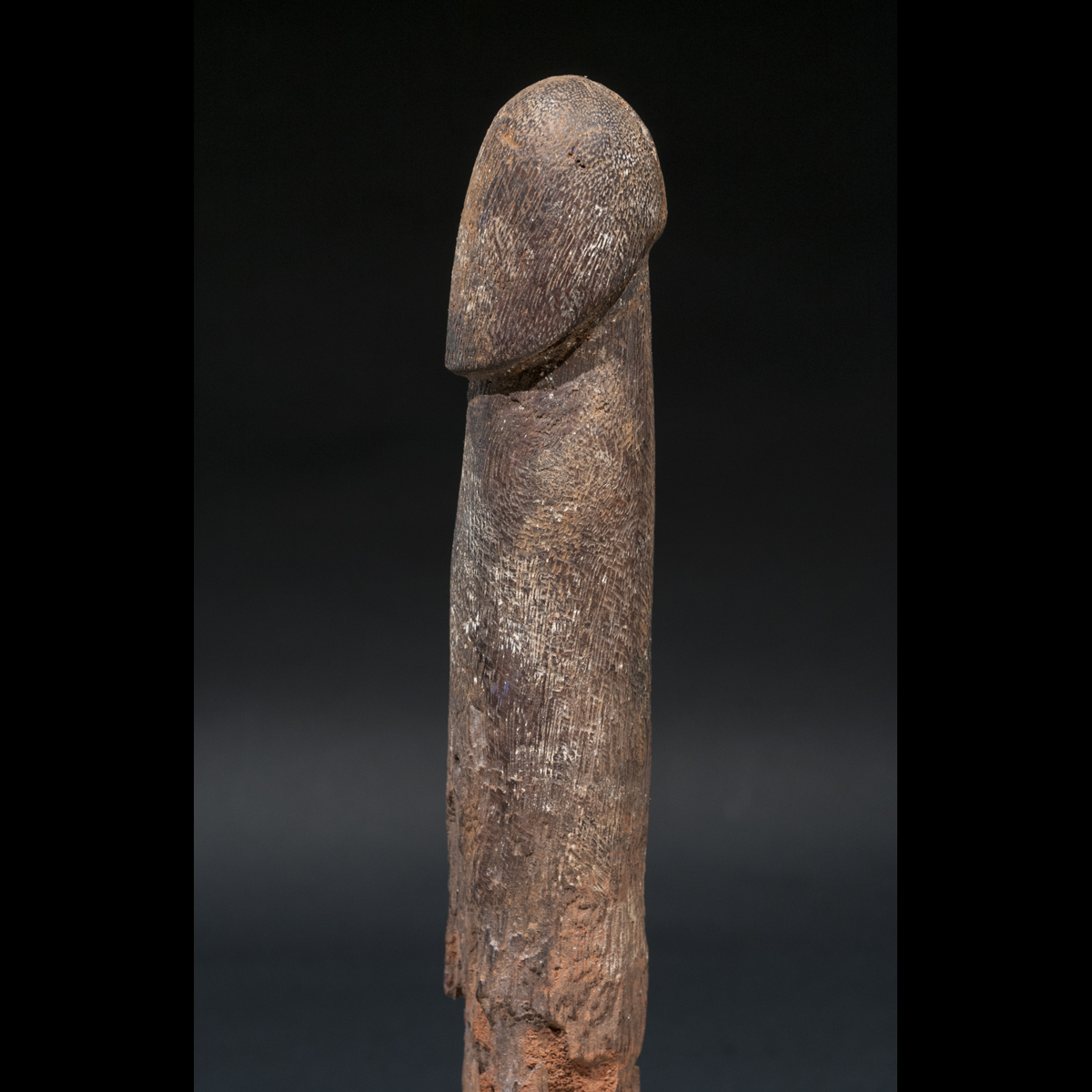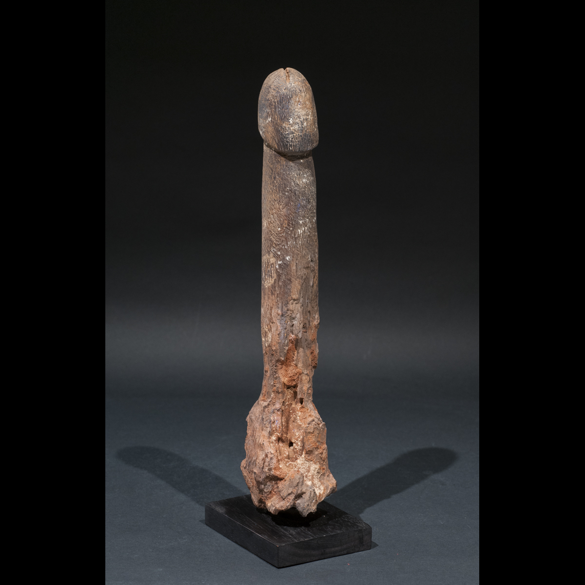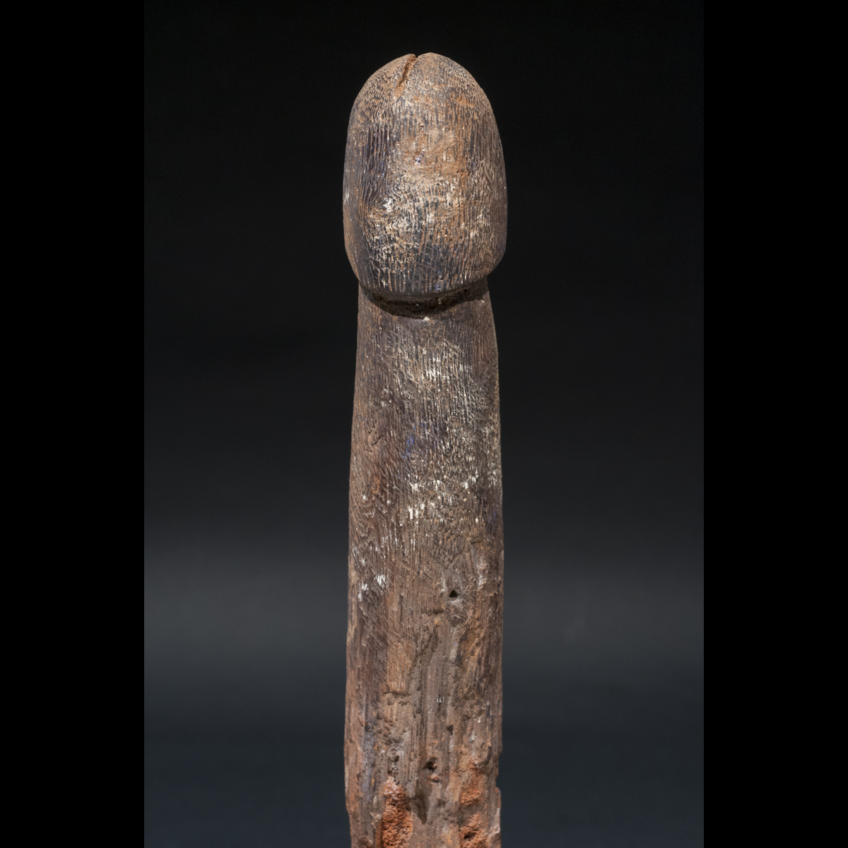 Belle représentation d'un sexe masculin en bois. Il était fiché dans une statue en terre crue à l'effigie de Legba, une puissante divinité Vaudou. Il est le gardien des routes et protecteur des villages. Une oeuvre bien sculpté avec beaucoup de présence. Le bois est ancien et oxydé. La base est érodé. Bois dense. Belle patine. Une pièce de collection Vaudou ancienne et authentique. Circa 1950.