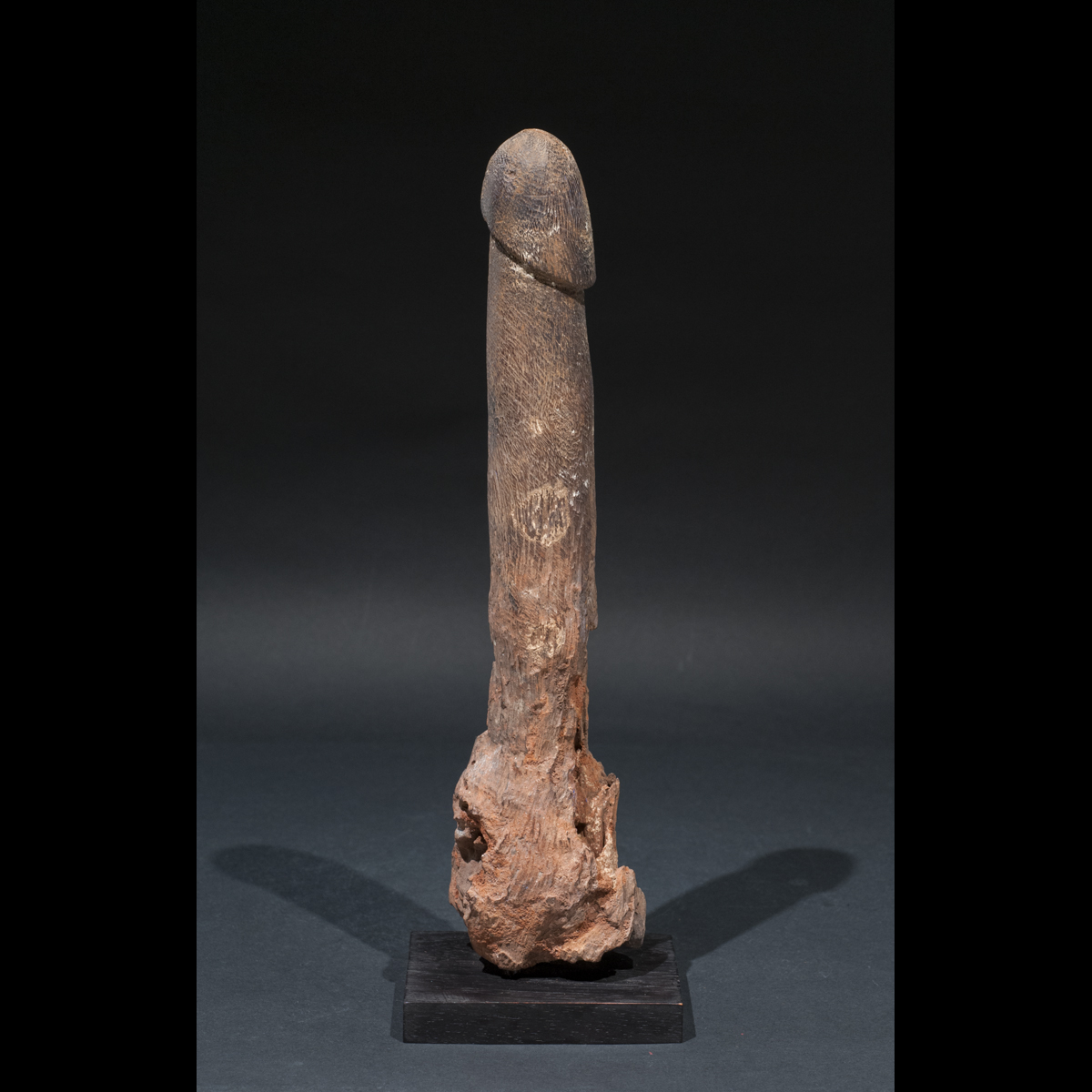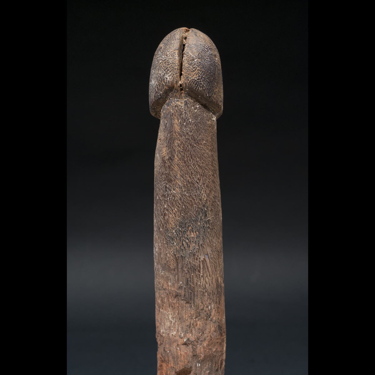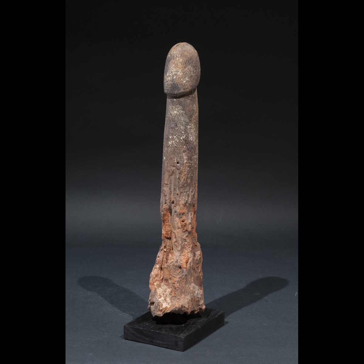 Belle représentation d'un sexe masculin en bois. Il était fiché dans une statue en terre crue à l'effigie de Legba, une puissante divinité Vaudou. Il est le gardien des routes et protecteur des villages. Une oeuvre bien sculpté avec beaucoup de présence. Le bois est ancien et oxydé. La base est érodé. Bois dense. Belle patine. Une pièce de collection Vaudou ancienne et authentique. Circa 1950.