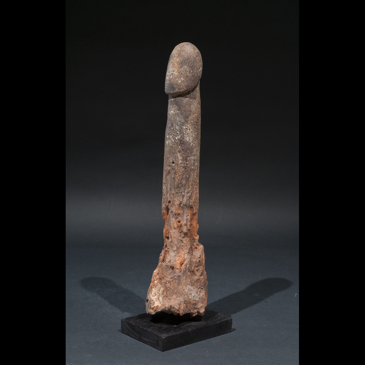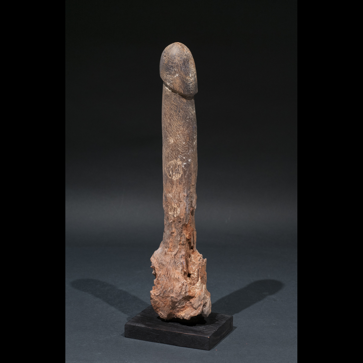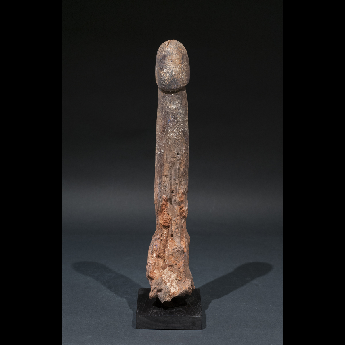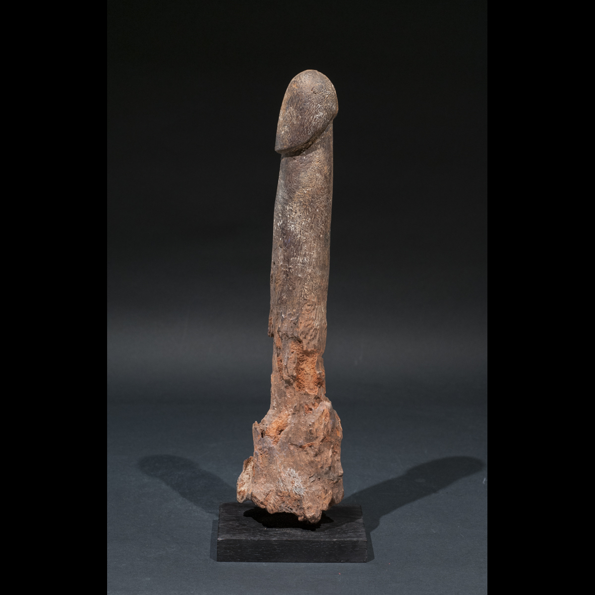 Belle représentation d'un sexe masculin en bois. Il était fiché dans une statue en terre crue à l'effigie de Legba, une puissante divinité Vaudou. Il est le gardien des routes et protecteur des villages. Une oeuvre bien sculpté avec beaucoup de présence. Le bois est ancien et oxydé. La base est érodé. Bois dense. Belle patine. Une pièce de collection Vaudou ancienne et authentique. Circa 1950.